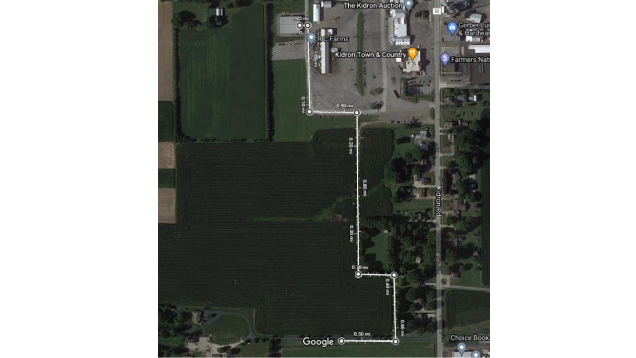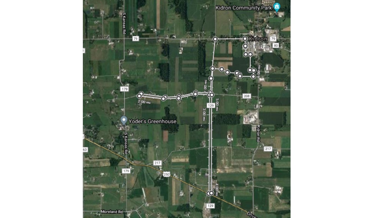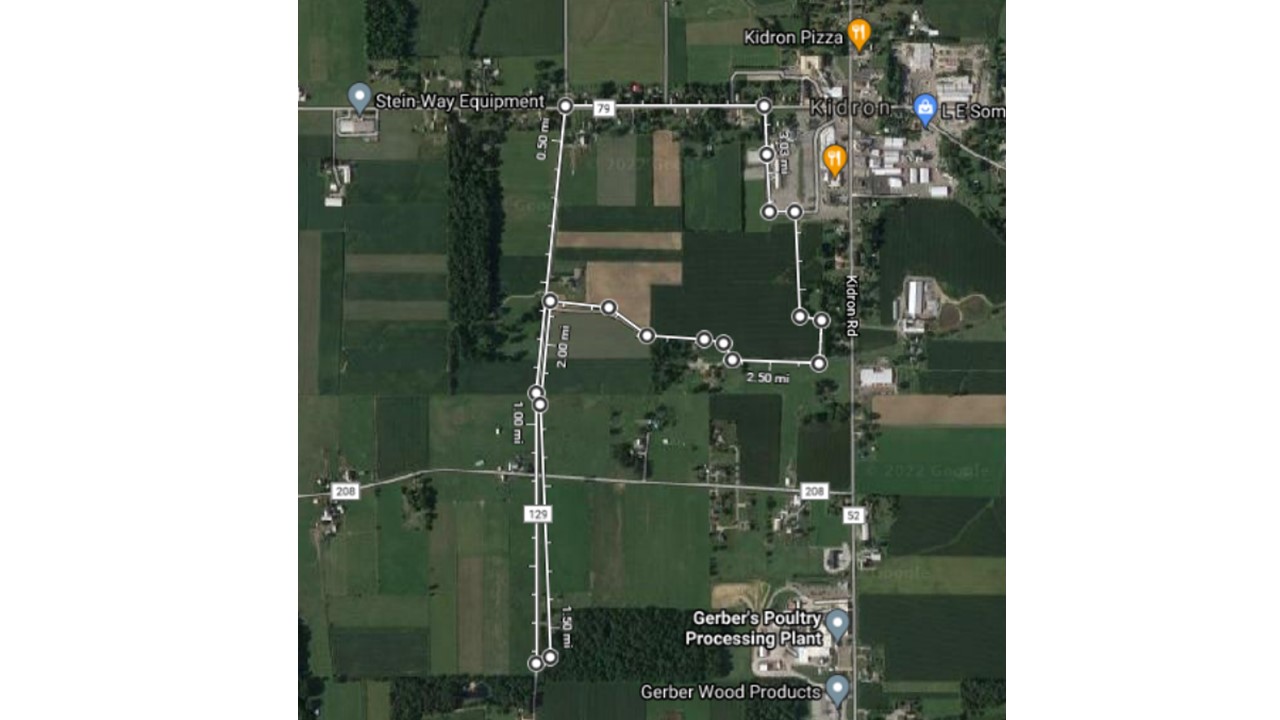 5k route detail: Sprunger Building drive, turn left on Emerson Rd, turn left on Kohler Rd south for approx 1.1 mile turn around at cone and head north for approx 3/4 mile, turn right for some field running follow signs to finish line.