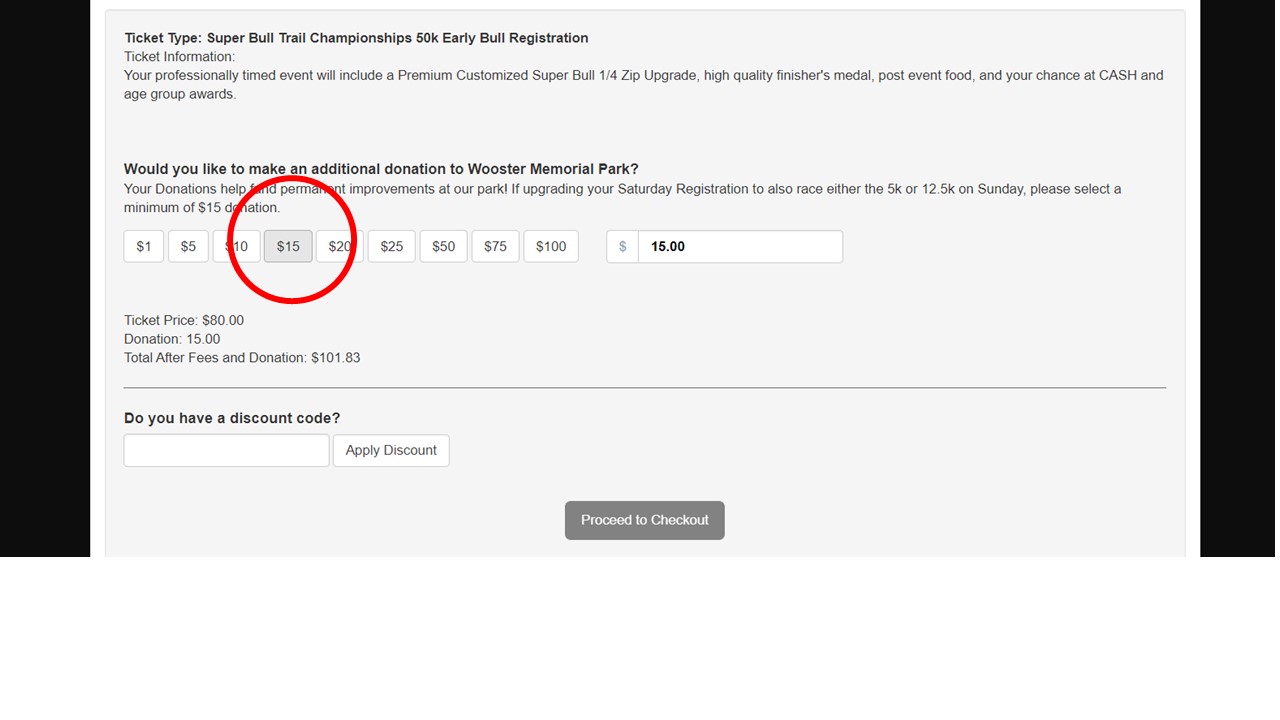 As shown below, just click a minimum of $15 at the donation portion of the registration page to add the 12.5k or 5k to your package. Your donation amount will be added to your total due and you'll be good to go! You are welcome to donate any amount you'd like, but $15 is the minimum to cover the upgrade to race one of the events on Sunday. The best part, 100% of your donation goes to Wooster Memorial Park! It's the ultimate win-win.